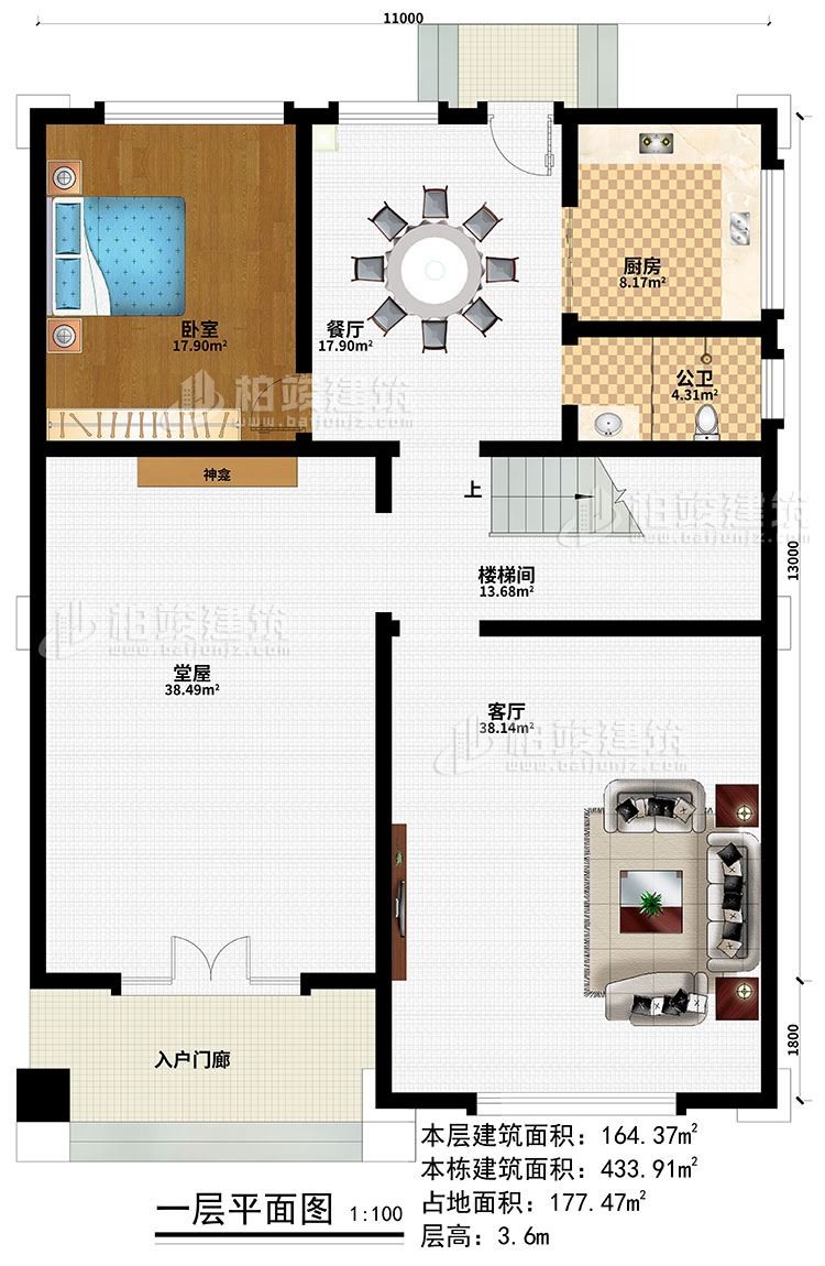一层:入户门廊、堂屋、神龛、客厅、餐厅、厨房、楼梯间、公卫